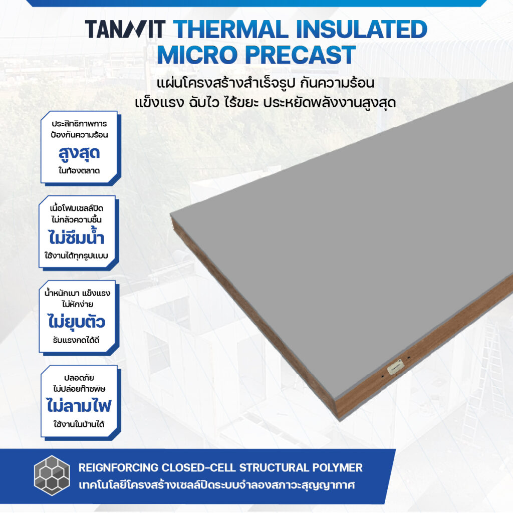 TANNIT THERMAL INSULATED MICRO PRECAST คือ แผ่นโครงสร้างสำเร็จรูปกันความร้อน ที่ผลิตโดยอาศัยเทคโนโลยีคอมโพลิตของวัสดุ เพื่อให้ได้มาซึ่งแผ่นพื้น ผนัง และเพดานสำเร็จรูปที่สามารถใช้รับกำลังเชิงโครงสร้างได้ โดยไม่จำเป็นต้องตั้งเสาหรือคาน